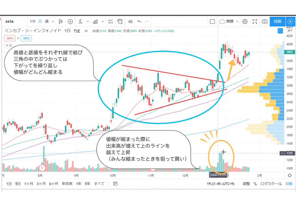 株価が上昇と下降を繰り返しながら、値幅が徐々に狭まっていくチャートパターン。出来高に伴って上昇する。トレンド転換やブレイクアウトのサインとして注目されます。