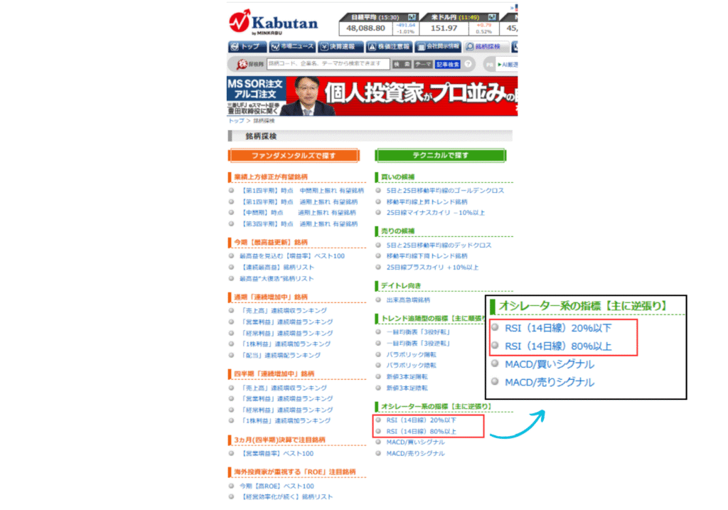株が買われすぎか売られすぎかを判断するオシレーター系の指標。一般的に70%以上で買われすぎ、30%以下で売られすぎと判断されます。