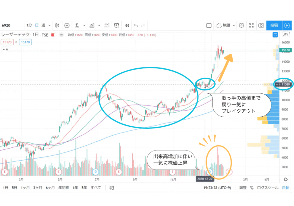 でもカップウィルズハンドだと思い、買いが集中、みんな保有したまま上昇を待つため一気にブレイクアウト!