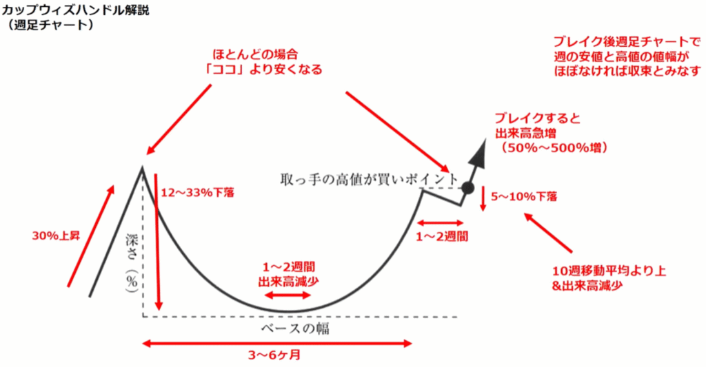 カップの形と取っ手の形に似たチャートパターン。上昇トレンドの途中で一時的に調整が入った後、再び上昇する可能性を示唆します。