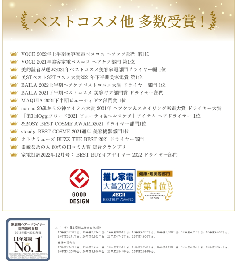 こちらはパナソニック製のドライヤーが数ある中でもメディア媒体でも多く取り上げられ、数々のベストコスメ・プロダクトを受賞をしているものとなります。
